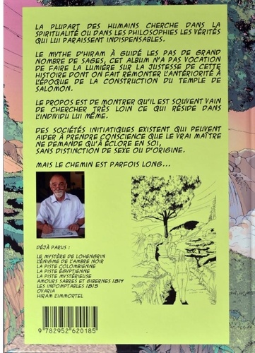 La plupart des humains cherche dans la spiritualité ou dans les philosophies les vérités qui lui paraissent indispensables. Le mythe d'HIRAM à guidé les pas de grand nombre de sages. Cet album n'a pas vocation de faire la lumière sur la justesse de cette histoire, dont on fait remonter l'antériorité à l'époque de la construction du temple de SALOMON. Le propos est de montrer qu'il est souvent vain de chercher très loin ce qui réside dans l'individu lui-même. Des sociétés initiatiques existent qui peuvent aider à prendre conscience que le vrai maître ne demande qu'à éclore en soi, sans distinction de sexe ou d'origine. Mais le chemin est parfois long...