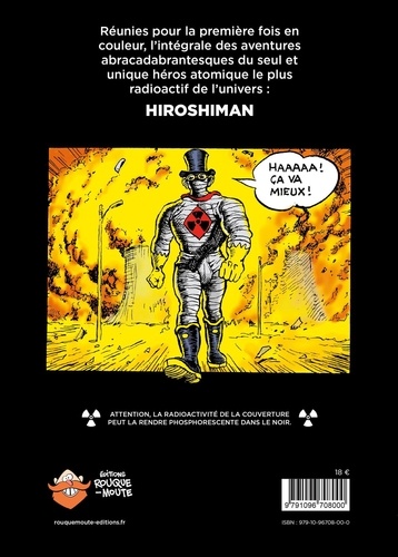 Voilà réunie, pour la première fois en couleur, l'intégrale des aventures abracadabrantesques du seul et unique héros atomique le plus radioactif de l'univers : Hiroshiman, dessiné par Rifo. Hiroshiman a été publié pour la première fois en 1993 dans le n°39 du mensuel de bandes dessinées Psikopat, puis en albums aux éditions du Zébu. La toute première planche d'Hiroshiman, dessinée en 1991 par Rifo, figure d'ailleurs parmi la galerie de dessins publiée en toute fin du volume 1 de cette intégrale. Hiroshiman est le fruit d'un synopsis absurde et efficace, annonciateur d'un futur apocalyptique. Une espèce de science-fiction d'anticipation complètement barrée. Et, chose étonnante, toujours indémodable et d'actualité. L'humour au second, voire au troisième degré des planches de Rifo dénonce aussi l'absurdité d'une humanité qui a cédé aux avances du nucléaire et qui laisse une planète jonchée de déchets radioactifs. Question énergie, les pouvoirs d'Hiroshiman carburent aux barrettes de plutonium. Au fil des planches, ce super héros, plutôt flegmatique, fait face aux nombreuses menaces qui pèsent sur Mégalopolis. Et y'a du boulot. Dans ce gigantesque labyrinthe urbain surpeuplé, il combat, au moyen de techniques pas toujours très catholiques, des monstres et des mutants sur fond d'humour crade, rythmé par les apparitions aléatoires de paires de seins lascives, car Rifo a aussi un bon œil pour ces choses-là.