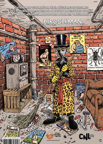 Les éditions Rouquemoute publient le second volume de l'intégrale des aventures abracadabrantesques du seul et unique héros atomique le plus radioactif de l'univers : HIROSHIMAN, dessiné par Rifo. Les précédents albums étant épuisés depuis des années, les éditions Rouquemoute ont ressuscité Hiroshiman en mars 2017 en publiant le premier volume de L'intégrale d'Hiroshiman. Cette intégrale compile les histoires courtes, à l'origine en N&B et mises en couleur par Rifo pour cette édition, parues à partir de 1993 dans le n°39 de Psikopat, "périodique libre et indépendant" de bandes dessinées fondé par Carali au début des années 1980. La première planche d'Hiroshiman, dessinée en 1991, figure d'ailleurs parmi la galerie de dessins publiée en toute fin du volume 1. Une histoire complète en N&B, Hiroshiman fait le clone, est également sortie chez Rouquemoute en février 2018. Via un synopsis absurde et efficace, Hiroshiman annonce un futur apocalyptique et joue d'une science-fiction d'anticipation complètement barrée à lire au second, voire au troisième degré. Au fil des planches, ce super-héros, plutôt flegmatique, fait face aux nombreuses menaces qui pèsent sur Mégalopolis. Et dans ce volume 2, y a du boulot : Calmar-Man, le monstre fumant et puant des toilettes, les nouilles mutantes de l'espace... Dans ce gigantesque labyrinthe urbain surpeuplé, il combat à coups de rayons gamma des monstres et des mutants sur fond d'humour crade. Muni d'une couverture avec rabats, le volume 2 de L'intégrale d'Hiroshiman contient 132 pages toutes en couleurs bourrées d'hommages cinématographiques, de clins d'oeil BD et de délires psychédéliques.