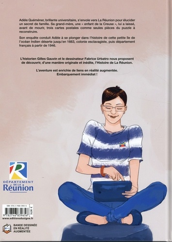 Adèle Quéméner, brillante universitaire, s'envole vers La Réunion pour élucider un secret de famille. Sa grand-mère, une "enfant de la Creuse", lui a laissé, avant de mourir, trois cartes postales comme seules pièces du puzzle à reconstruire. Son enquête conduit Adèle à se plonger dans l'histoire de cette petite île de l'océan Indien déserte jusqu'en 1663, colonie esclavagiste, puis département français à partir de 1946. L'historien Gilles Gauvin et le dessinateur Fabrice Urbatro nous proposent de découvrir, d'une manière originale et inédite, l'Histoire de La Réunion. L'aventure est enrichie de liens en réalité augmentée. Embarquement immédiat !