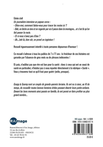 Génie civil Un journaliste interview un paysan corse : - Dites-moi, comment faites-vous pour tracer les routes ici ? - Bah, on lâche un âne et on regarde par où il passe dans la montagne... et c'est là qu'on fait passer la route. - Et si vous n'avez pas d'âne ? - Ah....beh là, bien sûr, on prend un ingénieur ! Recueil rigoureusement interdit à toute personne dépourvue d'humour ! Ce recueil s'adresse à tous les publics de 7 à 77 ans : la fraîcheur de ces histoires est garantie par l'absence de gros mots ou de phrases indécentes. Et puis, n'oubliez pas que rire est bon pour la santé : donc à ceux qui ont un souci de santé en particulier, n'hésitez pas à vous reporter directement à la rubrique "Santé". Vous y trouverez tout ce qu'il faut pour guérir (enfin, presque).