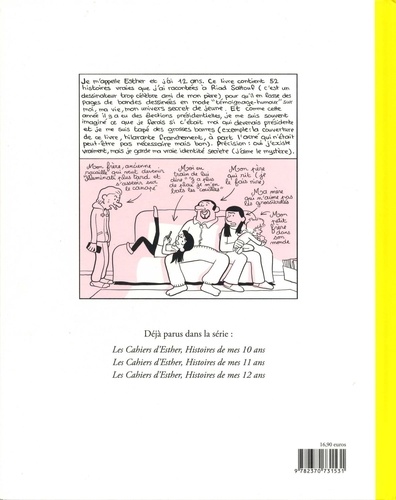 Chaque planche, prépubliée dans L'Obs, met en scène une anecdote réelle racontée à Riad Sattouf par la vraie Esther (une véritable petite fille dont le prénom a été changé). Un recueil sera publié chaque année, jusqu'aux 18 ans d'Esther. Dans ce troisième tome, Esther entre en sixième ! L'élection présidentielle, son premier téléphone portable, Manuela son hamster, l'arrivée de l'acné, son frère complotiste, son père mélenchoniste, sa mamy lepéniste, le président Macron l'Illuminati ou son amour pour la galette saucisson-abricot... Esther grandit, c'est l'année de ses 12 ans ! " Riad Sattouf continue de croquer l'adolescence comme nul autre. " ELLE " Un magnifique ethnographe de la vie ordinaire. " Libération " Le nouveau Petit Nicolas ! " Europe 1