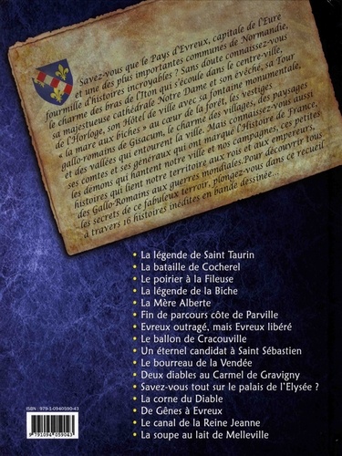 Savez-vous que le pays d'Evreux, capitale de l'Eure et une des plus importantes communes de Normandie, fourmille d'histoires incroyables ? Sans doute connaissez-vous le charme des bras de l'Iton qui s'écoule dans le centre-ville, sa majestueuse cathédrale Notre-Dame et son évêché, sa Tour de l'horloge, son Hôtel de ville avec sa fontaine monumentale, "la mare aux biches" au coeur de la forêt, les vestiges gallo-romains de Gisacum, le charme des villages, des paysages et des vallées qui entourent la ville. Mais connaissez-vous aussi ses comtes et ses généraux qui ont marqué l'Histoire de France, les démons qui hantent notre ville et nos campagnes, ces petites histoires qui lient notre territoire aux rois et aux empereurs, des Gallo-Romains aux guerres mondiales. Pour découvrir tous les secrets de ce fabuleux terroir, plongez-vous dans ce recueil à travers 16 histoires inédites en bande dessinée : La légende de Saint Taurin ; La bataille de Cocherel ; Le poirier à la Fileuse ; La légende de la Biche ; La Mère Alberte ; Fin de parcours côte de Parville ; Evreux outragé, mais Evreux libéré ; Le ballon de Cracouville ; Un éternel candidat à Saint Sébastien ; Le bourreau de la Vendée ; Deux diables au Carmel de Gravigny ; Savez-vous tout sur le palais de l'Elysée ; La corne du Diable ; De Gênes à Evreux ; Le canal de la Reine Jeanne ; La soupe au lait de Melleville.