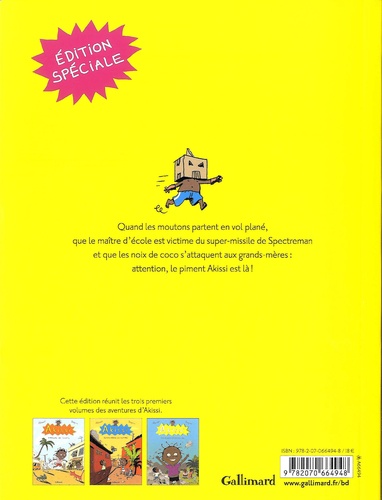 Quand les moutons partent en vol plané, que le maître d'école est victime du super-missile de Spectreman et que les noix de coco s'attaquent aux grands-mères : attention, le piment Akissi est là ! Cette édition réunit les trois premiers volumes de la série Akissi, de Marguerite Abouet et Mathieu Sapin : Attaque de chats, Super-héros en plâtre et Vacances dangereuses.