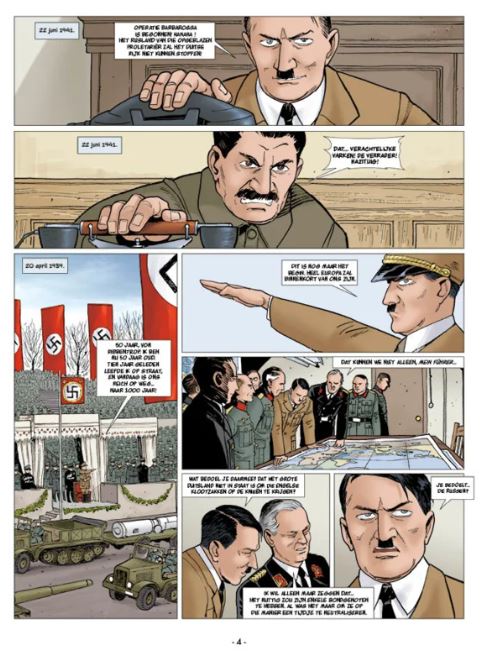 De cover is getekend door Fabrice Le Hénanff, die we kennen als auteur van de strips Ostfront , Westfront , H.H.Holmes ,.... Op 14 oktober 1812 bereikt Napoleon het doel van zijn Russische veldtocht, om Moskou in vlammen te zien opgaan. Wat is dat voor fanatiek volk, dat liever zijn hoofdstad vernietigt dan deze door de vijand te laten innemen? Ruim honderd jaar later bespreekt Hitler met von Ribbentrop de veroveringsstrategie van het Derde Rijk. Ze willen een alliantie aangaan met de Sovjet-Unie, om de handen vrij te hebben om Groot-Brittannië op de knieën te dwingen. Dat pact komt er. Stalin ziet het als een kans om wraak te nemen op het hooghartige westen. Op 1 september 1939 trekken nazi-tanks de westgrens van Polen over, dat geen partij is voor de overmacht. De Russen volgen het voorbeeld vanuit het oosten. Polen wordt verdeeld onder de twee agressors. Stalin maakt van de gelegenheid gebruik om de drie Baltische landen en Finland binnen te vallen. De bondgenoten overrompelen binnen korte tijd bijna heel Europa. In het Kremlin ontvangt Stalin een waarschuwing. De Führer is nog steeds sterk anti-communist. Zouden de nazi’s het wagen zich rechtstreeks met de nieuwe bondgenoten te meten?
