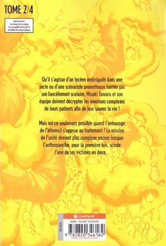 Qu'il s'agisse d'un lycéen embrigadé dans une secte ou d'une scénariste prometteuse hantée par son harcèlement scolaire, Misaki Tamaru et son équipe doivent décrypter les émotions complexes de leurs patients afin de leur sauver la vie ! Mais est-ce seulement possible quand l'entourage de l'hitomoji s'oppose au traitement ? La mission de l'unité devient plus complexe encore lorsque l'anthropamibe, pour la première fois, scinde l'une de ses victimes en deux...