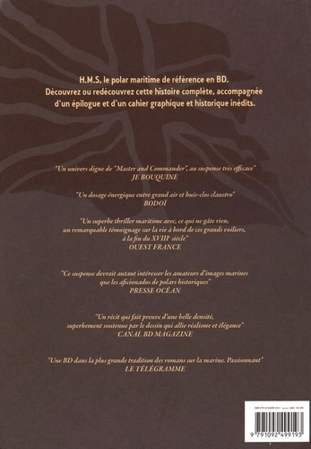 Les trois lettres HMS sont un préfixe de navire utilisé dans la Royal Navy qui correspondent à l'abréviation de Her Majesty's Ship ou His Majesty's Ship selon que le monarque anglais est de sexe féminin ou masculin... La série met en scène des navires britanniques à la fin du 18eme siècle, à une période qui se situe entre la Révolution Française et les guerres napoléoniennes. Il s'agit donc de récits qui s'apparentent au genre littéraire des " récits maritimes " . Les six volumes initialement parus chez Casterman racontent les aventures de John Fenton, un jeune médecin accusé de qui est emmené de force à bord de la Danaë, un navire de ligne de 74 canons. Il y fait ses débuts de matelot aux côtés de son ami Byam avant de se voir confié la charge de médecin du bord.A bord de la Danaë, John mène avec brio une enquête policière qui le fait remarquer par les services secrets de l'Amirauté britannique. Les trois aventures parues entre 2005 et 2011 (en fait, trois diptyques) sont en réalité une seule et même histoire qui mène John Fenton des côtes africaines aux Antilles en passant par la Méditerranée. HMS est une série extrêmement documentée sur l'univers maritime et la marine anglaise au 18eme siècle. Cette réédition en un seul volume donne à ce récit d'aventures historiques et policières une nouvelle dimension. Un épilogue inédit de 4 planches permet de répondre aux quelques questions restées en suspens. L'album est réalisé dans une édition de qualité, à l'instar de l'album " Wild River " . Il comprend également un dossier historique illustré et commenté de 13 pages. Ce sujet, avec l'actuel voyage de la frégate Hermione vers les côtes américaines, sera à nouveau dans l'actualité cet automne (l'Hermione doit revenir en France en septembre 2015).