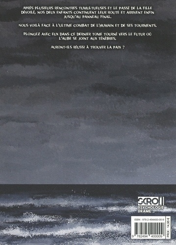 Après plusieurs rencontres tumultueuses et le passé de la fille dévoile, nos deux enfants continuent leur route et arrivent enfin jusqu'au panneau final. Nous voila face à l'ultime combat de l'humain et de ses tourments, plongez avec eux dans ce dernier tome tourné vers le futur ou l'aube se joint aux ténèbres, auront-ils réussi à trouver la paix ?