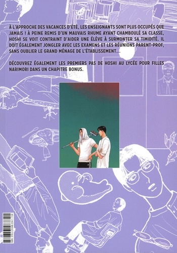A l'approche des vacances d'été, les enseignants sont plus occupés que jamais ! A peine remis d'un mauvais rhume ayant chamboule sa classe, Hoshi se voit contraint d'aider une élève a surmonter sa timidité. Il doit également jongler avec les examens et les réunions parent-prof, sans oublier le grand ménage de l'établissement... Découvrez également les premiers pas de Hoshi au lycée pour filles Narimori dans un chapitre bonus.