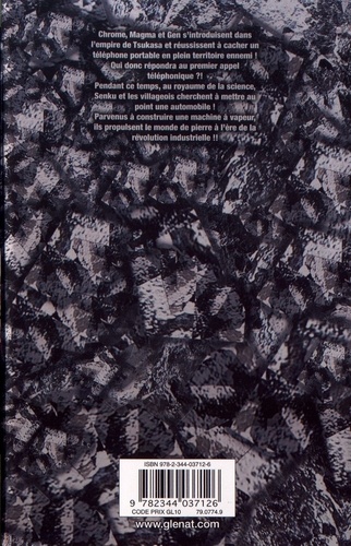 Quand l'information devient une arme au service de la science ! Chrome, Magma et Gen s'introduisent dans l'empire de Tsukasa et réussissent à cacher un téléphone portable en plein territoire ennemi ! Qui donc répondra au premier appel téléphonique ? ! Pendant ce temps, au royaume de la science, Senku et les villageois cherchent à mettre au point une automobile ! Parvenus à construire une machine à vapeur, ils propulsent le monde de pierre à l'ère de la révolution industrielle !!