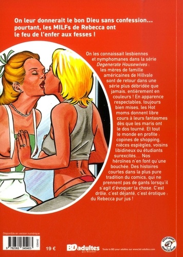 On leur donnerait le bon Dieu sans confession... pourtant, les MILFs de Rebecca ont le feu de l'enfer aux fesses ! On les connaissait lesbiennes et nymphomanes dans la série Degenerate Housewives : les mères de famille américaines de Hillvale sont de retour dans une série plus débridée que jamais, entièrement en couleurs ! En apparence respectables, toujours bien mises, les Hot moms donnent libre cours à leurs fantasmes dès que les maris ont le dos tourné. Et tout le monde en profite ? : copines de shopping, nièces espiègles, voisins libidineux ou étudiants surexcités... Nos héroïnes n'en font qu'une bouchée. Des histoires courtes dans la plus pure tradition du comics, qui ne prennent pas de gants lorsqu'il s'agit d'évoquer la chose. C'est drôle, c'est déjanté, c'est érotique : du Rebecca pur jus !