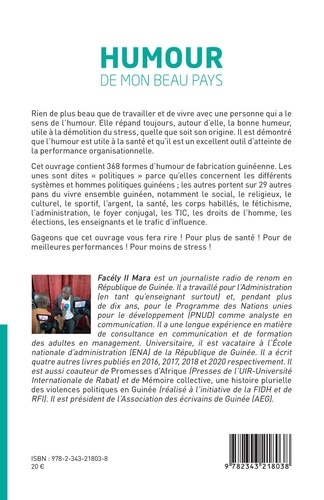 Rien de plus beau que de travailler et de vivre avec une personne qui a le sens de l'humour. Il est démontré que l'humour est utile à la santé et qu'il est un excellent outil d'atteinte de la performance organisationnelle. Cet ouvrage contient 368 formes d'humour de fabrication guinéenne. Les unes sont dites "politiques" parce qu'elles concernent les différents systèmes et hommes politiques guinéens ; les autres portent sur 29 autres pans du vivre ensemble guinéen, notamment le social, le religieux, le culturel, le sportif, l'argent, la santé, les corps habillés, le fétichisme, l'administration, le foyer conjugal, les TIC, les droits de l'homme, les élections, les enseignants et le trafic d'influence.