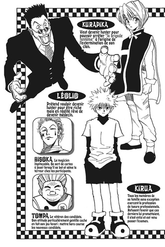 Les épreuves qui, les unes après les autres, se dressent devant les candidats au titre de Hunter, nous permettent de découvrir le caractère et le passé souvent trouble de chacun. On apprend ainsi que Kirua est vraiment issu d'une famille de tueurs professionnels et qu'il peut se montrer aussi fort que cruel !