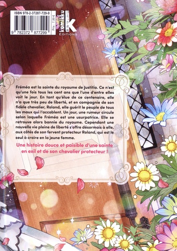 Bannie, mais désormais libre ? Fréméa commence une nouvelle vie aux côtés de son fidèle chevalier ! Fréméa est la sainte du royaume de Justitia. Ce n'est qu'une fois tous les cent ans que l'une d'entre elles voit le jour. En tant qu'élue de ce centenaire, elle n'a que très peu de liberté, et en compagnie de son fidèle chevalier, Roland, elle guérit le peuple de tous les maux qui l'accablent. Un jour, une rumeur circule selon laquelle Fréméa est une usurpatrice. Elle se retrouve alors bannie du royaume. Cependant une nouvelle vie pleine de liberté s'offre désormais à elle, aux côtés de son fervent protecteur Roland, qui est le seul à croire en la jeune femme. Une histoire douce et paisible d'une sainte en exil et de son chevalier protecteur !