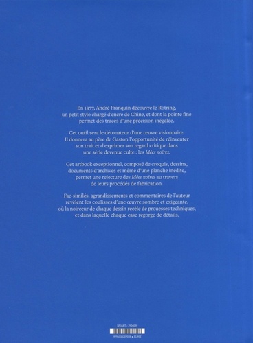 En 1977, André Franquin découvre le Rotring, un petit stylo chargé d'encre de Chine, et dont la pointe fine permet des tracés d'une précision inégalée. Cet outil sera le détonateur d'une oeuvre visionnaire. Il donnera au père de Gaston l'opportunité de réinventer son trait et d'exprimer son regard critique dans une série devenue culte : les Idées noires. Cet artbook exceptionnel, composé de croquis, dessins, documents d'archives et même d'une planche inédite, permet une relecture des Idées noires au travers de leurs procédés de fabrication. Fac-similés, agrandissements et commentaires de l'auteur révèlent les coulisses d'une oeuvre sombre et exigeante, où la noirceur de chaque dessin recèle de prouesses techniques, et dans laquelle chaque case regorge de détails.
