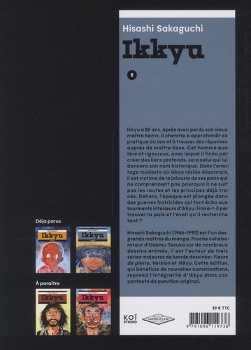 Moine zen, fils illégitime d'un empereur, Ikkyu interroge la foi et les règles de son époque. Son esprit libre et ses préceptes vont profondément marquer non seulement le bouddhisme japonais mais aussi la culture japonaise, jusqu'à nos jours. Rebaptisé Sojun dans ce deuxième volume, le moine en devenir approfondit sa foi et sa pratique auprès du sévère et célèbre Sodon Kaso. Continuant à chercher sa propre voie, il est victime de la jalousie et de l'incompréhension de ses pairs. La guerre fait rage entre le shogunat et les grands seigneurs locaux, amenant toujours plus de tristesse et de misère. C'est dans ce contexte que Sojun quitte son nouveau maître, qui l'a rebaptisé Ikkyu ("le repos"), pour poursuivre son destin au sein du peuple. Mangaka et animateur de dessin animé, Hisashi Sakaguchi est né le 5 mai 1946 à Tokyo et décède le 22 décembre 1995. Il commence sa carrière comme intervalliste pour les studios d'animation d'Osamu Tezuka. Passionné par la bande dessinée, et particulièrement désireux de contrôler entièrement les objets issus de son génie créatif, il abandonne le cinéma d'animation au tournant des années 1970 pour se consacrer à la réalisation de plusieurs mangas, dont les plus connus sont Ikkyu, Version et Fleurs de pierre (éd. Revival, 5 volumes, 2023-2025).