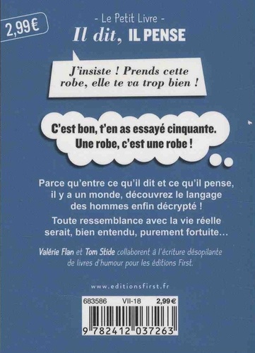 Un petit livre hilarant qui décrypte le langage homme-femme ! Le premier dictionnaire pour bien comprendre les hommes et progresser rapidement. Toutes les expressions les plus courantes traduites en langage homme-femme pour communiquer en toute situation ! Un livre indispensable... Il dit : Je vais chez Julien pour la finale de la coupe de la ligue. Il pense : On va enfin se faire une soirée mecs, sans meufs pour nous les briser ! Il dit : Je ne sais pas du tout où sont les passeports. Il pense : Si c'est toi qui les cherches, tu trouveras dix fois plus vite que moi. Il dit : Pourquoi t'organiserais pas un ciné entre filles samedi soir ? ça te ferait du bien ! Il pense : Casse-toi, j'ai besoin d'air ! Il dit : J'aimais bien quand t'avais cette coiffure... Il pense : En ce moment, t'es un peu coiffée comme une merde, quand même ! Il dit : Ah, tu mets des sous-vêtements en dentelle, maintenant ? Il pense : Putain de merde, je suis cocu ! Il dit : Les enfants ! Aidez maman à mettre la table ! Il pense : Quand est-ce qu'on bouffe, je crève la dalle ? Il dit : Tu ressembles de plus en plus à ta mère. Il pense : AU SECOURS !!! ! Il dit : Je n'ai pas d'opinion sur le sujet. Il pense : Etant donné que si je ne suis pas d'accord avec toi, je m'en prends plein les dents, je préfère me taire ! Il dit : Non, y a rien, je t'assure. Il pense : Tu vas pas t'y mettre, j'ai déjà ma maîtresse sur le dos, c'est bon !