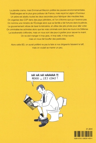 La planète crame, mais Emmanuel Macron préfère les pauses environnementales. TotalEnergies est le plus gros pollueur de France, mais reçoit la Légion d'honneur. Un arbre est abattu toutes les deux secondes pour fabriquer des meubles Ikea. On organise des COP dans des pays pétroliers, et l'on s'étonne que ça n'avance pas. On nomme une ministre de l'Ecologie alors que sa famille a fait fortune dans le pétrole. Le gouvernement refuse de taxer le kérosène, et utilise des jets privés pour aller voter. On criminalise les activistes alors que les vrais criminels sont dans les tours à la Défense. La biodiversité s'effondre, mais on nous sort des jeux à gratter pour sauver le vivant. On ne doit manger ni trop gras, ni trop salé, ni trop sucré, mais on nous fait bouffer des pesticides. Alors cette BD, on aurait préféré ne pas la faire si nos dirigeants faisaient le taff, mais on voulait se marrer un peu.