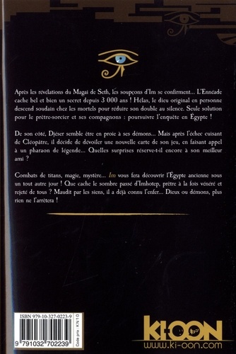 Après les révélations du Magai de Seth, les soupçons d'Im se confirment... L'Ennéade cache bel et bien un secret depuis 3 000 ans ! Hélas, le dieu original en personne descend soudain chez les mortels pour réduire son double au silence. Seule solution pour le prêtre-sorcier et ses compagnons : poursuivre l'enquête en Egypte ! De son côté, Djéser semble être en proie à ses démons... Mais après l'échec cuisant de Cléopâtre, il décide de dévoiler une nouvelle carte de son jeu, en faisant appel à un pharaon de légende... Quelles surprises réserve-t-il encore à son meilleur ami ? Combats de titans, magie, mystère... Im vous fera découvrir l'Egypte ancienne sous un tout autre jour ! Que cache le sombre passé d'Imhotep, prêtre à la fois vénéré et rejeté de tous ? Maudit par les siens, il a déjà connu l'enfer... Dieux ou démons, plus rien ne l'arrêtera !