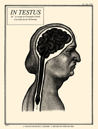 Leporello en 7 étapes du voyage qui mena Christophe Colomb aux Amériques. Chaque étape est présentée comme une planche scientifique d'anatomie. Le point de départ est un serpent qui part du cerveau de Christophe Colomb pour finalement aller se nicher dans le ventre d'un ours.