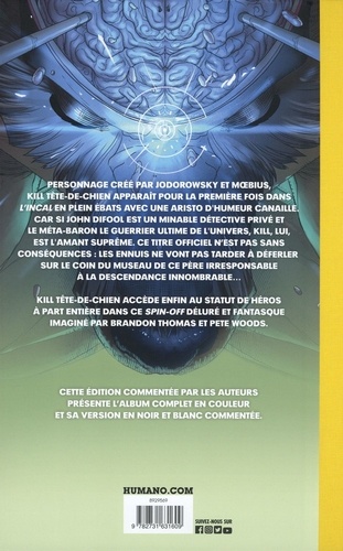 personnage crée par Jodorowsky et Moebius, Kill Tête-de-Chien apparait pour la première fois dans l'Incal en plein ébats avec une aristo d'humeur canaille. Car si John Difool est un minable détective privé et le méta-baron le guerrier ultime de l'univers, Kill, lui, est l'amant suprême. Ce titre officiel n'est pas sans conséquences : les ennuis ne vont pas tarder a déferler sur le coin du museau de ce père irresponsable à la descendance innombrable... Kill Tête-de-Chien accède enfin au status de héros à part entière dans ce spin-off déluré et fantasque imaginé par Brandon Thomas et Pete Woods.