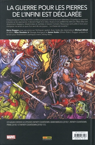La guerre pour les Pierres de l'Infini est déclarée. Chacune des six Pierres de l'Infini confère un pouvoir immense à son détenteur. Si quelqu'un parvient à toutes se les approprier, il devient l'égal d'un dieu ! Aussi a-t-on préféré les détruire. Mais elles ont récemment réapparu, disséminées et cachées à travers l'univers. Beaucoup sont prêts à tout pour s'emparer ne serait-ce que d'un seul de ces joyaux... La chasse est ouverte l Gerry Duggan pose ses pions sur l'échiquier spatial. Avec l'aide des dessinateurs Michael Allred (X-Statix), Mike Deodato Jr (Savage Avengers) et Aaron Kuder (Ghost Rider), Duggan prepare le terrain pour l'événement cosmique à venir, Infinity Wars. Cet album contient les épisodes Infinity Countdown : Adam Warlock (2018) 1, Infinity Countdown : Prime (2018) 1 et Infinity Countdown (2018)1 à 5. La quête pour réunir les Pierres de l'Infini a commencé. Les Gardiens de la Galaxie, Adam Warlock, Wolverine ou encore Loki sont à leur recherche. Mais Thanos et Ultron sont aussi de la partie... Découvrez le prologue à Infinity Wars. Pivot entre la série Guardians of the Galaxy et Infinity Wars, cet album one-shot est un immanquable pour tous les fans de récits cosmiques.