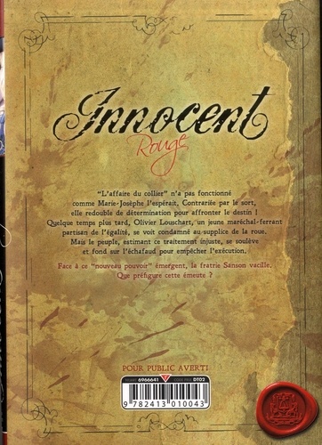 Dans Innocent Rouge, place à la Révolution française vue à travers les yeux de Charles-Henri Sanson, bourreau des rois. Par l'auteur d'Ascension. à l'aube de la Révolution, Charles-Henri Sanson, maître des hautes oeuvres de Paris, règne sur la famille des exécuteurs de France. Sa jeune soeur Marie-Josèphe, en charge de l'office de Versailles, devient incontrôlable à la mort d'Alain, son premier amour. Elle se jure de le venger en éliminant son assassin et ne recule devant rien pour renverser le système déficient qui lui a coûté la vie.