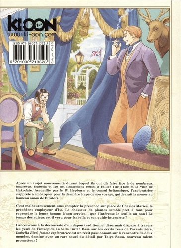 Le Japon du XIXe siècle hors des sentiers battus ! Avant de quitter Akita, Isabella est approchée une dernière fois par le Dr Kobayashi : l'homme lui fournit des vivres et l'informe que le Dr Hepburn l'attendra à Hakodate dans sept jours pour lui administrer les soins nécessaires à sa santé fragile. Malheureusement, les éléments ne permettent pas aux voyageurs de progresser aus- si vite qu'escompté ! Après avoir affronté les flots déchaînés du fleuve Yoneshiro, l'aventurière et son guide doivent faire face à la colère de la montagne... Arriveront- ils à temps au point de rendez-vous ? Lancez-vous à la découverte d'un Japon traditionnel désormais disparu à tra- vers les yeux de l'intrépide Isabella Bird ! Basé sur les écrits réels de l'aven- turière, Isabella Bird, femme exploratrice est un récit passionnant sur la ren- contre de deux mondes, dessiné avec un rare souci du détail par Taiga Sassa, nouveau talent prometteur !