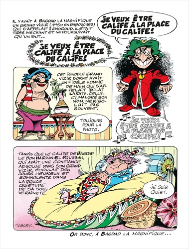 La légende raconte qu'à Bagdad la magnifique, un grand vizir répondant au nom d'Iznogoud, particulièrement mal intentionné, cultive l'ambition de ravir le trône du calife Haroun El Poussah. D'où son expression favorite qui revient sans cesse : "je veux être calife à la place du calife ! ". Secondé par Dilat Laraht, Iznogoud multiplie les tentatives les plus diverses et surtout les plus folles pour arriver à ses fins. En vain, bien sûr ! Fidèle à l'esprit des Milles et une Nuits version loufoque, les auteurs ont inventé cette série en 1962 pour RECORD. Mais c'est dans les pages de PILOTE (1968) qu'Iznogoud trouvera un réel succès Après un bref passage aux éditions Glénat, Tabary décide de s'auto-éditer en créant les éditions de la Séguinière puis les éditions Tabary. (12 albums).