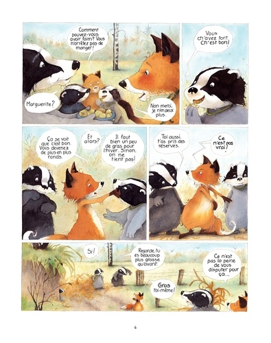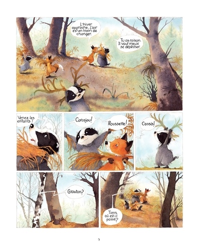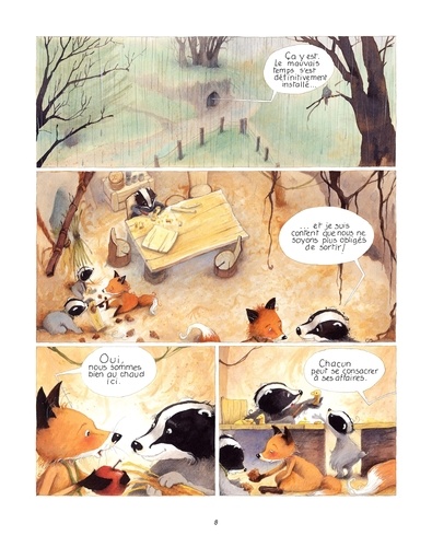 L'hiver approche. Monsieur Blaireau, madame renarde, Glouton, Carcajou, Roussette et Cassis se dépêchent de préparer leur "maison" avant l'arrivée du grand froid. Oui mais voilà, les blaireaux et les renards, ça ne vit pas l'hiver de la même manière ! Les blaireaux en profitent pour dormir, encore et encore, au plus grand plaisir de Glouton, ce qui n'est pas du goût de Roussette, qui aimerait bien jouer. Madame renarde décide donc d'initier sa fille à l'art de la chasse ! Comment Monsieur Blaireau, madame renarde et leur tribu vont-ils traverser leur premier hiver ensemble ? Chaque tome de la série sera dorénavant proposé à partir de 2026 en version souple à plus petit format (195 x 260) avec un bonus de huit pages supplémentaires (jeux, cahier didactique...). Le tout à petit prix !