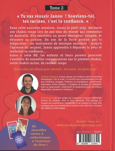 " Tu vas réussir Janou ! Souviens-toi, tes racines, c'est ta confiance. " Dans cette nouvelle aventure, Janou le petit yogi, découvre son chakra rouge lors de son tour du monde qui commence en Australie. Elle rencontre un jeune aborigène, Jangala, et découvre sa culture. Du son de la Terre produit par le didgeridoo - un instrument de musique ancestral - jusqu'à l'épreuve du serpent, Janou apprendra à dépasser la peur et renforcer sa confiance... Grâce à cette BD, les enfants et leurs parents pourront s'enrichir de nouvelles connaissances sur le premier chakra, notre chakra racine, de couleur rouge. Ouvre vite cet album pour devenir, toi aussi, un petit yogi ! "Cartes à collectionner à l'intérieur du livre. (Cartes chakra, sens, son, élément, expériences)".