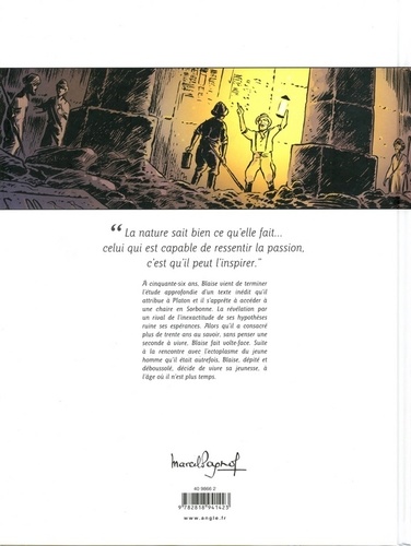A cinquante-six ans, Blaise vient de terminer l'étude approfondie d'un texte inédit qu'il attribue à Platon et il s'apprête à accéder à une chaire en Sorbonne. La révélation par un rival de l'inexactitude de ses hypothèses ruine ses espérances. Alors qu'il a consacré plus de trente ans au savoir, sans penser une seconde à vivre, Blaise fait volte-face. Suite à la rencontre avec l'ectoplasme du jeune homme qu'il était autrefois, Blaise, dépité et déboussolé, décide de vivre sa jeunesse, à l'âge où il n'est plus temps.