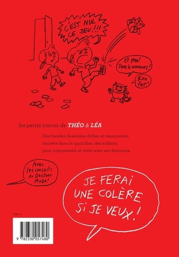Collection LES PETITS TRACAS DE THEO ET LEA Histoires courtes, graphisme simple, dialogues directs entre les personnages, ces petites BD, campées dans la vie quotidienne, sont destinées aux enfants à partir de 5 ans. Tout à la fois drôles et rassurantes, elles aident les enfants à comprendre les mécanismes de leurs émotions dans le but d'apprendre, petit à petit, à les gérer. En fin d'ouvrage, des pistes de réflexion simples pour donner lieu à une discussion parents-enfants. JE FERAI UNE COLERE SI JE VEUX ! Théo joue aux cartes avec sa soeur mais il est en train de perdre et il le prend très mal. Il jette en l'air les cartes, aussi Léa s'en va-t-elle. Choisira-t-il ensuite de se calmer ou bien de laisser exploser sa colère ? Mais que gagnera-t-il à se montrer insupportable ? Une petite bande dessinée drôle et rassurante pour aider les enfants - et leurs parents - à comprendre les mécanismes de leurs émotions et à apprendre à mieux vivre avec les autres.
