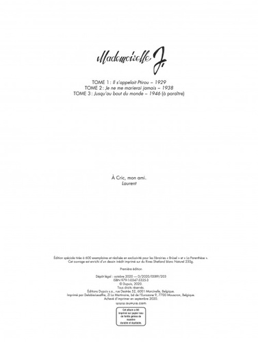 En 1937, la fille du patron de la Compagnie Générale Transatlantique, Juliette, a 22 ans, son diplôme en poche, et s'apprête à tenter de devenir grand reporter. Son père, qui a entretemps fondé sa propre compagnie de cargos, se voit proposer par Gustave Noirhomme, son associé, une offre difficile à refuser : Herr Von Riblach, homme de confiance de Hitler concernant la marine civile, voudrait entrer dans le capital de la Compagnie des Cinq Océans. Juliette, bien consciente des projets d'invasion des nazis, refuse tout net. Malgré les réticences machistes des rédacteurs en chef, Juliette n'abandonne pas son rêve de devenir grand reporter et le journal Horizon France lui donne l'occasion de montrer sa valeur en l'engageant comme stagiaire de Daniel Fraiser, journaliste aguerri mais particulièrement désagréable. Gustave Noirhomme, lui, est prêt à tout pour que Juliette cède ses parts aux nazis... Avec "Mademoiselle J", Yves Sente et Laurent Verron font du XXe siècle une passionnante épopée !