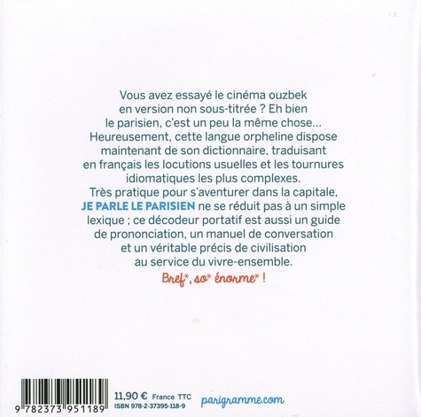 LE DICTIONNAIRE FRANCO-PARISIEN Vous avez essayé le cinéma ouzbek en version non sous-titrée ? Eh bien le parisien, c'est un peu la même chose... Heureusement, cette langue orpheline dispose maintenant de son dictionnaire, traduisant en français les locutions usuelles et les tournures idiomatiques les plus complexes. Très pratique pour s'aventurer dans la capitale, Je parle le parisien ne se réduit pas à un simple lexique ; ce décodeur portatif est aussi un guide de prononciation, un manuel de conversation et un véritable précis de civilisation au service du vivre-ensemble. Bref, so énorme !