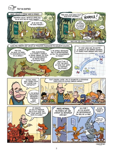 C'est dur de passer de la jungle au collège. Mais c'est encore plus compliqué quand on est en slip ! Jean-Mowgli, fils adoptif du roi de la jungle, débarque en Europe pour poursuivre ses études, au collège. Il vit en slip, ses parents sont un couple de singes et il a un rhinocéros de compagnie. C'est un ado presque comme les autres, en somme. Chaperonné par sa grand-mère et un vieux paon intello, Jean-Mowgli découvre les us et coutumes du collégien occidental... et surtout leurs problèmes quotidiens : profs, famille, portable, acné, hygiène, rapport aux autres, etc. De sacrées occasions de bien rigoler !