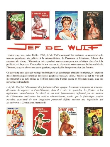 Pendant vingt ans, entre 1948 et 1968, Jef de Wulf a composé des centaines de couvertures de romans populaires, du policier à la science-fiction, de l'aventure à l'érotisme. Admiré des amateurs de pin-up, l'illustrateur est cependant moins connu pour ses créations réservées à la publicité et à la presse. L'ensemble de ses travaux ici répertoriés nous montrent la face cachée de l'homme, avec ses obsessions et ses passions, en particulier la représentation des femmes. On découvre aussi dans cet ouvrage les influences du dessinateur à travers ses thèmes, et l'étendue de ses talents en parcourant les différentes palettes de son Art. Enfin, l'histoire de Jef de Wulf est incontournable du petit milieu de l'édition parisienne d'après-guerre en plein renouveau, avec ses personnages truculents.