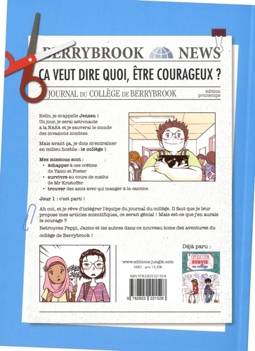 Hello, je m'appelle Jensen ! Un jour, je serai astronaute à la NASA et je sauverai le monde des invasions zombies. Mais avant ça, je dois m'entrainer en milieu hostile : le collège ! Mes missions sont : échapper à ces crétins de Yanic et Foster ; survivre au cours de maths de Mr Kristoffer ; trouver des amis avec qui manger à la cantine. Jour 1 : c'est parti ! Ah oui, et je rêve d'intégrer l'équipe du journal du collège. Il faut que je leur propose mes articles scientifiques, ce serait génial ! Mais est-ce que j'en aurais le courage ? Retrouvez Peppi, Jaime et les autres dans ce nouveau tome des aventures du collège de Berrybrook !