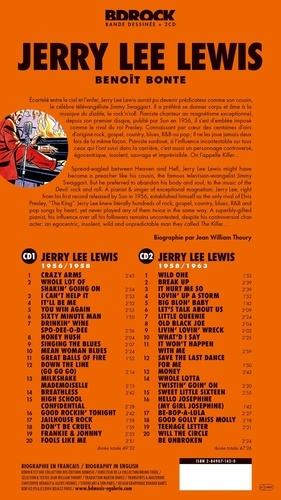 Une biographie de Jerry Lee Lewis, écrite par Jean William Thoury, illustrée par Benoit Bonte, accompagnée de 2 compact discs. Ecartelé entre le ciel et l'enfer, Jerry Lee Lewis aurait pu devenir prédicateur comme son cousin, le célèbre télévangéliste Jimmy Swaggart. Il a préféré se donner corps et âme à la musique du diable, le rock'n'roll. Pianiste chanteur au magnétisme exceptionnel, depuis son premier disque, publié par Sun en 1956, il s'est d'emblée imposé comme le rival du roi Presley. Connaissant par coeur des centaines d'airs d'origine rock, gospel, country, blues, R&B ou pop ; il ne les joue jamais deux fois de la même façon. Pianiste surdoué, à l'influence incontestable sur tous ceux qui l'ont suivi dans la carrière, c'est aussi un personnage controversé, égocentrique, insolent, sauvage et imprévisible. On l'appelle Killer... Jerry Lee Lewis CD 1 01 - Crazy Arms (Ralph E. Mooney - Charles P. Seals) 2'45 Novembre 1956 - Roland Janes (guit.) ; James Van Eaton (batt.). 02 - Whole Lot of Shakin' Going on (David Curly Williams) 2'54 Décembre 1956 - Roland Janes (guit.) ; J. -W. Brown (basse) ; James Van Eaton (batt.). 03 - I Can't Help it (Hank Williams)2'53 Décembre 1956 - idem 02. 04 - It'll Be Me (Jack H. Clement)2'52 Février 1957 - idem 01. 05 - You Win Again (Hank Williams) 2'55 Avril 1957 - idem 01. 06 - Sixty Minute Man (William E. Ward)1'50 Juin 1957 - idem 02. 07 - Drinkin' Wine Spo-Dee-o-Dee (Granville Stick McGhee - J. Mayo Williams) 2'36 Juillet 1957 - Roland Janes (guit.) ; J. -W. Brown et/ou Billy Riley (basse) ; James Van Eaton (batt.). 08 - Honey Hush (Joe Turner)2'04 Juillet 1957 - idem 07. 09 - Singing the Blues (Melvin Endsley) 2'07 Juillet 1957 - idem 07. 10 - Mean Woman Blues (Claude Demetrius) 2'24 Septembre 1957 - idem 07. 11 - Great Balls of Fire (Jack Hammer - Otis Blackwell) 1'52 Octobre 1957 - idem 01. 12 - Down the Line (Go Go Go) (Roy Orbison) 2'14 Janvier 1958 - Billy Riley (guit.) ; J. -W. Brown/Stan Kesler (basse) ; James Van Eton (batt.). 13 - Milkshake Mademoiselle (Jack Hammer) 2'13 Janvier 1958 - idem 12. 14 - Breathless (Otis Blackwell) 2'42 Janvier 1958 - idem 12. 15 - High School Confidential (Ron Hardgrave - Jerry Lee Lewis) 2'28 Février 1958 - idem 01. 16 - Good Rockin' Tonight (Roy Brown) 2'42 Mars 1958 - idem 01. 17 - Jailhouse Rock (Jerry Leiber - Mike Stoller) 1'58 Mars 1958 - idem 01. 18 - Don't Be Cruel (Elvis Presley - Otis Blackwell) 1'59 Mars 1958 - idem 01. 19 - Frankie & Johnny (trad. arrgt. Jerry Lee Lewis) 2'33 Mars 1958 - idem 07. 20 - Fools Like Me (Jack H. Clement - Murphy M. Maddux Jr.) 2'51 Avril 1958 - idem 07. TOTAL TIME : 49'32 CD 2 01 - Wild One (John Michael O'Keefe - Johnny Vincent Greenan - David Morris Owens) 1'52 Avril 1958 - Roland Janes (guit.) ; Billy Riley (basse) ; James Van Eaton (batt.). 02 - Break up (Charlie Rich) 2'39 Juillet 1958 - Billy Riley (guit.) ; Jack Clement (basse) ; Otis Jett et/ou James Van Eaton (batt.). 03 - It Hurt Me So (Bill Justis - Charlie Rich) 2'39 Novembre 1958 - Charlie Rich (piano) ; Roland Janes et Billy Riley (guit.) ; Martin Willis (saxo) ; Cliff Acred (basse) ; Jeff Davis et/ou James Van Eaton (batt.). 04 - Lovin' Up a Storm (Thelma Blackmon - Eddy Arnold) 1'52 Décembre 1958 - Roland Janes (guit.) ; J. -W. Brown et/ou Billy Riley (basse) ; James Van Eaton (batt.). 05 - Big Blon' Baby (Rhoda Roberts - Kenny Jacobson) 1'42 Décembre 1958 - idem 04. 06 - Let's Talk About Us (Otis Blackwell) 2'09 Mars 1959 - Brad Suggs et Roland Janes (guit.) ; Cliff Acred (basse) ; James Van Eaton (batt.). 07 - Little Queenie (Chuck Berry) 2'24 Mai 1959 - idem 06. 08 - Old Black Joe (trad. arrgt. Jerry Lee Lewis) 2'04 Janvier 1960 -Roland Janes (guit.) ; R. W. Stevenson (basse) ; James Van Eaton (batt.). 09 - Livin' Lovin' Wreck (Otis Blackwell) 2'02 Février 1961 - Hank Garland et Kelton Herston (guit.) ; Bob Moore (basse) ; Buddy Harman (batt.) ; Anita Kerr Singers (choeur). 10 - What'd I Say (Ray Charles) 2'25 Février 1961 - idem 09. 11 - It Won't Happen with Me (Raymond Lamont Evans) 2'59 Juin 1961 - Wayne Moss et Kelton Herston (guit.) ; Marvin Hughes (orgue) ; Bob Moore (basse) ; Buddy Harman (batt.) ; Anita Kerr Singers (choeur). 12 - Save the Last Dance for Me (Doc Pomus - Mort Shuman) 1'50 Juin 1961 - idem 11. 13 - Money (Berry Gordy - William Robinson) 2'42 Septembre 1961 - Jerry Kennedy (guit.) ; Jerry Tuttle (orgue) ; Boots Randolph, Carl Gavin, Jim Hall (saxo) ; William McElhiney, Cameron Mullins, Donald Sheffield, John Wilkin (cuivres) ; Bob Moore (basse) ; Buddy Harman (batt.). 14 - Whole Lotta Twistin' Goin' on (David Curly Williams) 3'20 Janvier 1962 - Roland Janes et Brad Suggs (guit.) ; R. W. McGhee (basse) ; Al jackson (batt.). 15 - Sweet Little Sixteen (Chuck Berry) 2'55 Juin 1962 - Roland Janes et Scotty Moore (guit.) ; Shirley Sisk (orgue) ; J. -W. Brown (basse) ; Buddy Harman (batt.). 16 - Hello Josephine (My Girl Josephine) (Antoine Fats Domino - Dave Bartholomew) 1'42 Juin 1962 - idem 15. 17 - Be-Bop-a-Lula (Gene Vincent - William Sherif Tex Davis) 2'27 Juin 1962 - Roland Janes et Scotty Moore (guit.) ; Shirley Sisk (orgue) ; J. -W. Brown (basse) ; Al Jackson (batt.). 18 - Good Golly Miss Molly (John S. Marascalco - Robert Alexander Blackwell) 2'18 Septembre 1962 - Fred Carter et Kelton Herston (guit.) ; Boots Randolph (saxo) ; Lightning Chance (basse) ; Buddy Harman (batt.). 19 - Teenage Letter (Renald Richard Jr.) 2'21 Mars 1963 - Scotty Moore (guit.) ; W. R. Fields (orgue) ; Luke Wright (saxo) ; George Webb (basse) ; Tarp Tarrant (batt.). 20 - Will the Circle Be Unbroken (trad. arrgt. Jerry Lee Lewis) 2'24 Décembre 1956 - Roland Janes (guit.) ; J. -W. Brown (basse) ; James Van Eaton (batt.). TOTAL TIME : 47'26