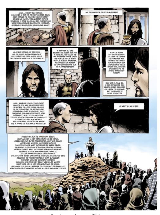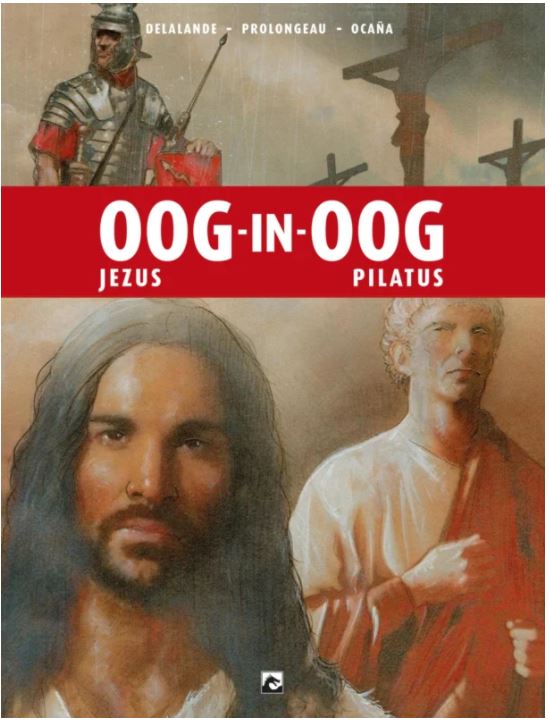 De cover is getekend door Fabrice Le Hénanff, die we kennen als auteur van de strips Ostfront , Westfront , H.H.Holmes ,.... Mijn naam is Pontius Pilatus. Ik beval de executie en de kruisiging van degene die Jezus van Nazareth heette. Als het avond wordt in Judea, de dag na deze bizarre dagen, is het aan mij om het echte verslag van deze verschrikkelijke uren aan het nageslacht over te laten. Ik weet niet welke plicht mij verplicht om de realiteit te melden van wat mijn ogen zagen en van de rol die ik moest spelen in deze noodlottige rechtszaak. Zo is het allemaal begonnen ... Het tweede deel van de oog-in-oog-serie, ondertekend door de schrijvers Arnaud Delalande en Denis Gombert en de ontwerper Maunel Garcia, onderzoekt de confrontatie tussen Jezus en Pilatus, waarvan de uitkomst de loop van de geschiedenis voor altijd veranderde.