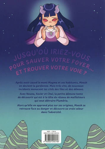 Jusqu'où iriez-vous pour sauver votre foyer... et trouver votre voie ? Après avoir sauvé le mont Magma et ses habitants, Meesh en devient la gardienne. Mais très vite, de nouveaux incidents menacent les cités des fées et des démons. Avec Nouna, Xavier et Chaï, la petite démone tente de découvrir qui est à la tête du réseau de malfaiteurs qui veut détruire Pluméria. Alors qu'elle en apprend plus sur ses origines, Meesh se retrouve face au danger et découvre sa vraie valeur dans l'adversité.
