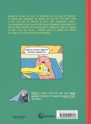 Une BD à l'humour décalé et aux personnages ultra attachants qui aborde la notion de différence, la quête d'identité et le sentiment de nostalgie qui vient en grandissant. Avec couverture phosphorescente ! Lorsque la voisine de Boris lui demande de s'occuper de son animal de compagnie, Babette, Boris n'hésite pas une seconde. Oui, mais voilà, les parents de Boris sont 100% anti-animal de compagnie... ! Boris va alors devoir redoubler d'inventité pour cacher son existence, d'autant que Babette n'est pas un animal comme les autres... Elle est jaune, marche sur deux pattes, adore la télévision et les films d'horreur... mais surtout, Babette est douée de la parole ! Cette BD remporte le prix Max und Moritz Award (le second plus grand prix en Allemagne), dans la catégorie des meilleures bandes dessinées pour enfants.