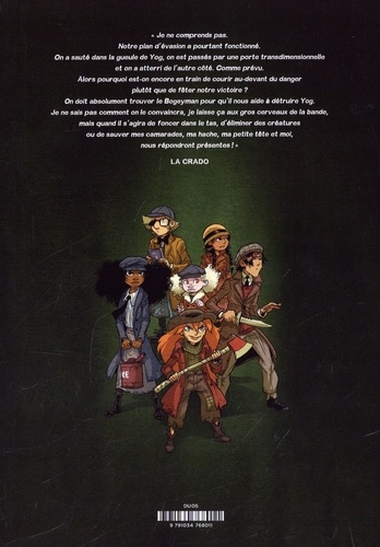 "Je ne comprends pas. Notre plan d'évasion a pourtant fonctionné. On a sauté dans la gueule de Yog, on est passés par une porte transdlmensionnelle et on a atterri de l'autre côté. Comme prévu. Alors pourquoi est-on encore en train de courir au-devant du danger plutôt que de roter notre victoire ? On doit absolument trouver le Bogeyman pour qu'il nous aide a détruire Yog. Je ne sais pas comment on le convaincra, Je laisse ça aux gros cerveaux de la bande, mals quand il s'agira de foncer dans le tas, d'éliminer des créatures ou de sauver mes camarades, ma hache, ma petite tête et mol, nous répondront présentes ! ".