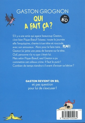 S'il y a une amie qui agace beaucoup Gaston, c'est bien Pique-Boeuf l'oiseau : toute la journée elle l'enquiquine, chante à tue-tête et roucoule avec son amoureux. Alors pour la faire taire... PLAF ! Gaston lui jette une peau de banane sur la tête. Ouf, personne n'a vu que c'était lui. Mais selon Pique-Boeuf, seul Gaston a pu commettre cet odieux crime. Il faut le punir ! Combien de temps tiendra-t-il avant d'avouer sa bêtise ?