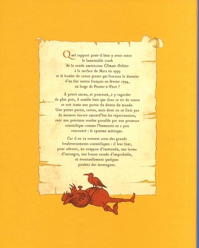 Février 1794, en pleine mer des Caraïbes, Louis, canonnier du bateau pirate Le Fieffé Coquin, vise toujours juste ! Mais cette fois, la recette est maigre : vin, pommes, pruneaux et... un savant. Un savant français qui plus est : Joseph Dombey. Envoyé par le gouvernement révolutionnaire pour rencontrer le président américain, il transporte une mystérieuse mallette qui intrigue les terribles pirates - pas si terribles que ça, pour être honnête ; plutôt une communauté adepte de chorale... A l'ouverture : une étrange barre graduée, un contenant cubique et un drôle de cylindre, faits dans un métal sans valeur. Pour les pirates, c'est forcément une arme secrète. Devant "l'élite intellectuelle" des pirates de Cocagna, Dombey dévoile le fleuron de la technologie française, l'instrument révolutionnaire : le mètre décimal ! Sans oublier le cube de dix centimètres de côté pour mesurer le litre, ni, enfin, le cylindre en cuivre d'un kilogramme. Chacun pourra ainsi tout mesurer, peser, quantifier... Ce à quoi les pirates répondent "Ni Dieu, ni maître, ni mètre ! " . Dombey parviendra-t-il à échapper à ces réfractaires au "progrès" pour mener à bien sa mission ? Ce sens irrésistible de la formule est bien évidemment celui de Wilfrid Lupano, entre autres scénariste des Vieux Fourneaux. Ses dialogues truculents sont mis en images par le formidable Léonard Chemineau : le duo de La Bibliomule de Cordoue est donc à nouveau réuni, et son talent pour mêler fable humoristique et chronique historique ne s'est pas émoussé !