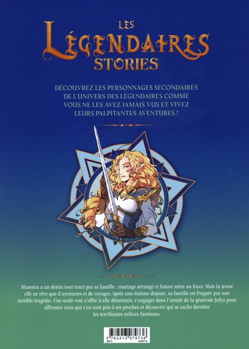 Avec Les Légendaires Stories, Patrick Sobral ouvre les portes de son univers à d'autres artistes de BD. Aurore nous dévoile ici la vie mouvementée de Shamira, la mère de Shimy. Shamira a un destin tout tracé par sa famille : mariage arrangé et future mère au foyer. Mais la jeune elfe ne rêve que d'aventures et de voyages. Après une énième dispute, sa famille est frappée par une terrible tragédie. Une seule voie s'offre à elle désormais, s'engager dans l'armée de la générale Julya pour affronter ceux qui s'en sont pris à ses proches et découvrir qui se cache derrière les terrifiantes milices fantômes.