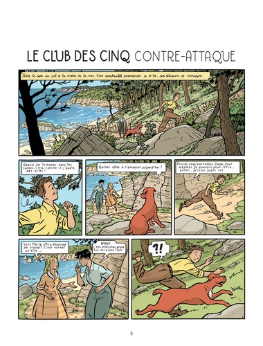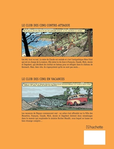 Le club des cinq contre-attaque. Cet été, tout va mal. La mère de Claude est malade et c'est l'antipathique Mme Eliot qui est en charge de la maison. Elle mène la vie dure à François, Claude, Mick, Annie et Dagobert, qui décident de s'enfuir en bateau pour se réfugier dans le château de Kermach. Mais, bien vite, ils s'aperçoivent qu'ils ne sont pas seuls... Le club des cinq en vacances. Les vacances de Pâques commencent mal : un arbre s'est effondré sur la Villa des Mouettes, François, Claude, Mick, Annie et Dagobert doivent donc emménager dans le manoir qui surplombe le sinistre Rocher Maudit, sous lequel se trame un bien étrange complot...