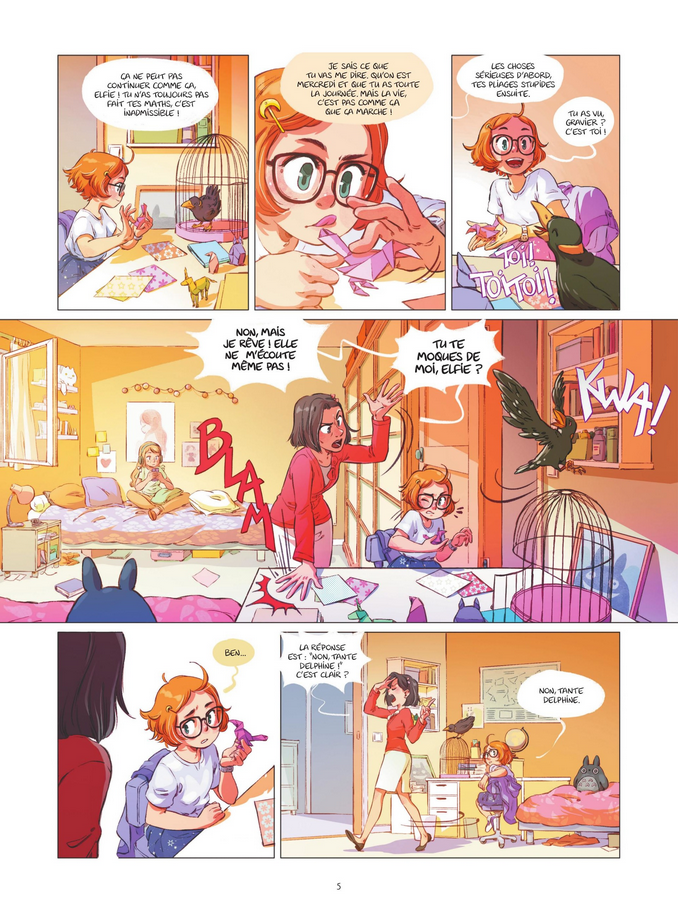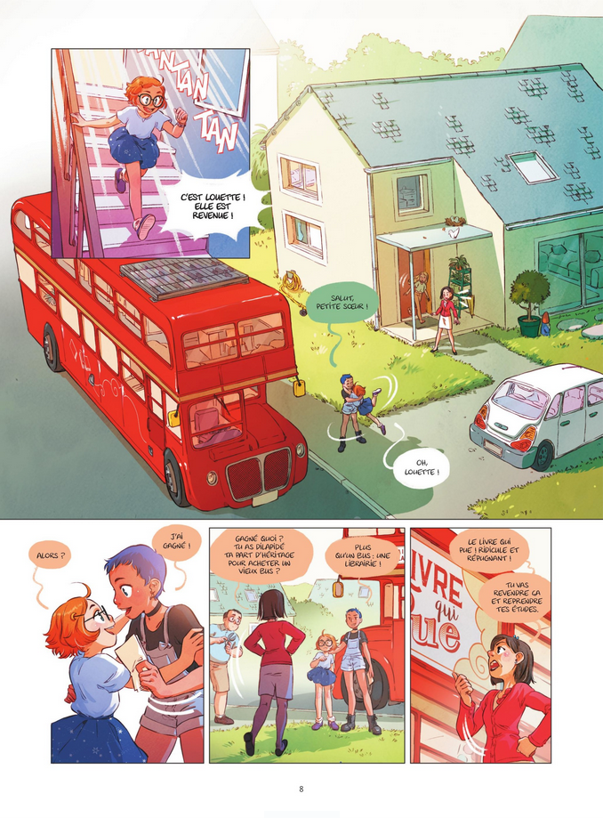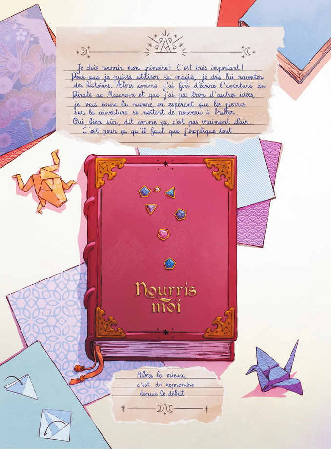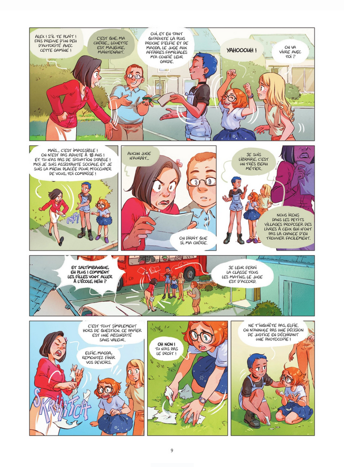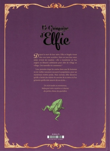 Un récit tendre et aventureux, entre mystères et charme des petites choses du quotidien. Elfie et Magda vivent depuis la mort de leur mère chez une tante acariâtre. Mais un jour leur soeur aînée revient de Londres : elle a transformé un bus anglais en librairie ambulante pour aller de village en village. Une nouvelle vie commence ! Leur première étape les amène dans une île bretonne où de vieilles rancoeurs secouent la population, pour un mystérieux timbre perdu. Mais surtout, Elfie découvre qu'elle a hérité des talents de sorcière de sa mère, et d'un grimoire qu'elle doit nourrir de ses écrits. Etourdie, créative, déterminée, passionnée d'origamis et d'astronomie, Elfie est un personnage attachant qui utilise une magie douce pour modifier le cours des évènements. Mais ça ne marchera pas toujours, et il faudra parfois ruser contre la magie elle-même pour la faire fonctionner ! Un récit tendre et aventureux, balançant entre mystères et charme des petites choses du quotidien, une histoire envoûtante tant pour les plus jeunes que leurs parents.