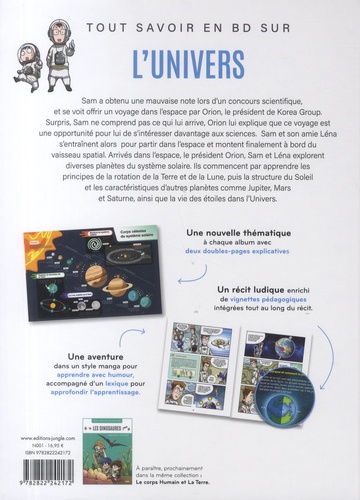 " Tout savoir en BD ", une série pour informer de façon ludique la nouvelle génération à propos des sciences humaines et naturelles. Sam a obtenu une mauvaise note lors d'un concours scientifique et se voit offrir un voyage dans l'espace par Orion, le président de Korea Group. Surpris, Sam ne comprend pas ce qui lui arrive, Orion lui explique que ce voyage est une opportunité pour lui de s'intéresser davantage aux sciences. Sam et son amie Léna s'entraînent alors pour partir dans l'espace et montent finalement à bord du vaisseau spatial. Arrivés dans l'espace, le président Orion, Sam et Léna explorent diverses planètes du système solaire. Ils commencent par apprendre les principes de la rotation de la Terre et de la Lune, puis la structure du Soleil et les caractéristiques d'autres planètes comme Jupiter, Mars et Saturne. Ils découvrent aussi la vie des étoiles dans l'Univers. A chaque album une nouvelle thématique et une double page déroulante explicative en fin d'album. Un récit ludique enrichi de vignettes pédagogiques intégrées tout au long du récit. Un univers graphique de style manga et une aventure pour apprendre avec humour, accompagné d'un lexique pour approfondir l'apprentissage.