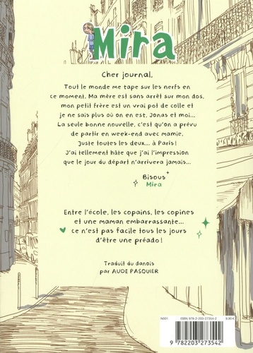 Mira, une héroïne attachante à laquelle toutes les pré-ados adoreront s'identifier ! Pas facile d'être une pré-ado quand on doit gérer une maman embarrassante, un petit frère pot de colle, des filles désagréables à l'école, une première déception amoureuse... Et, pour Mira, s'ajoute à tout cela le décès brutal de sa grand-mère dont elle était si proche... Alors que toutes les deux s'apprêtaient à partir pour Paris, c'est finalement avec sa mère que Mira prend le chemin de la ville lumière. En partageant leur tristesse, avec nostalgie et beaucoup d'amour, Mira et sa mère sont plus fortes pour traverser cette épreuve. Une plongée à Copenhague (et à Paris ! ) dans le quotidien d'une presque pré-ado ultra attachante !